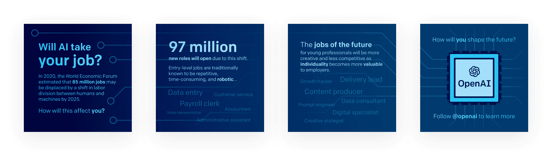 The campaign opens with an instrumental message in the form of an attention-grabbing question, based on my research into AI anxiety. To strengthen this message, I included statistics from the World Economic Forum to provide context to the issue being addressed. In addition, the first tile encourages the audience to swipe to the next tile with a leading lines and a question addressing them directly.